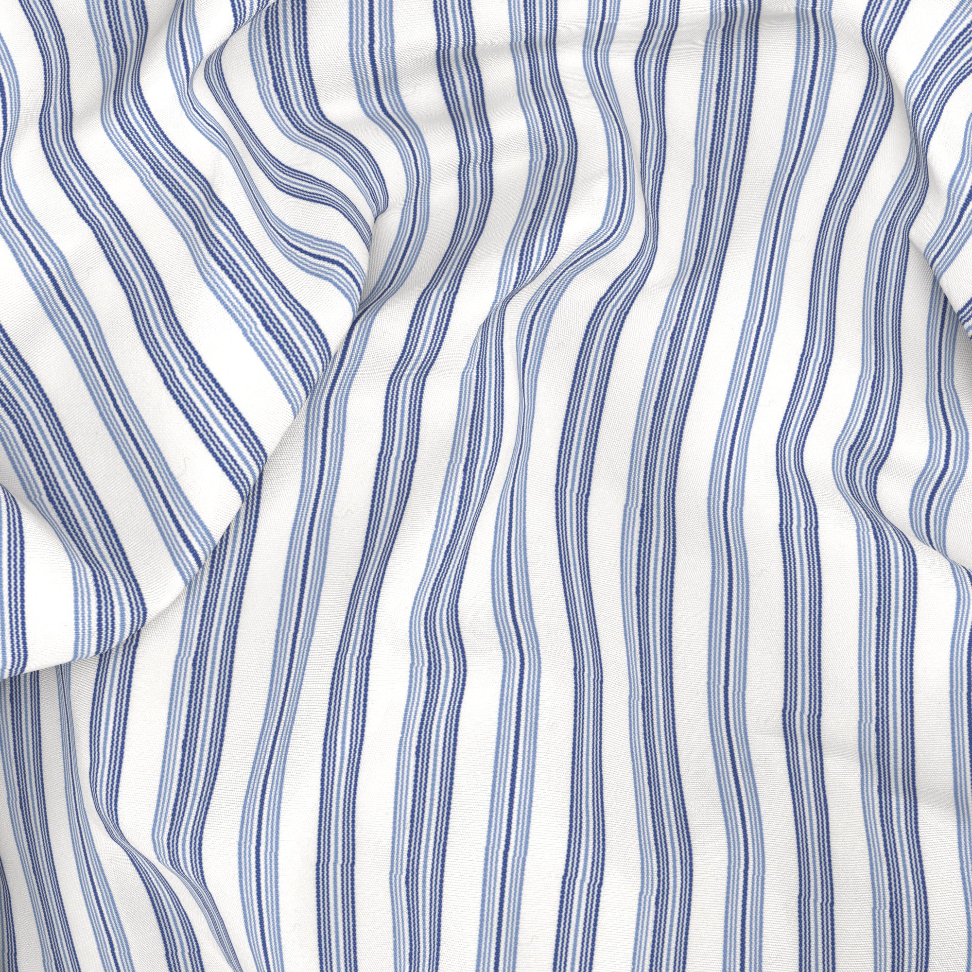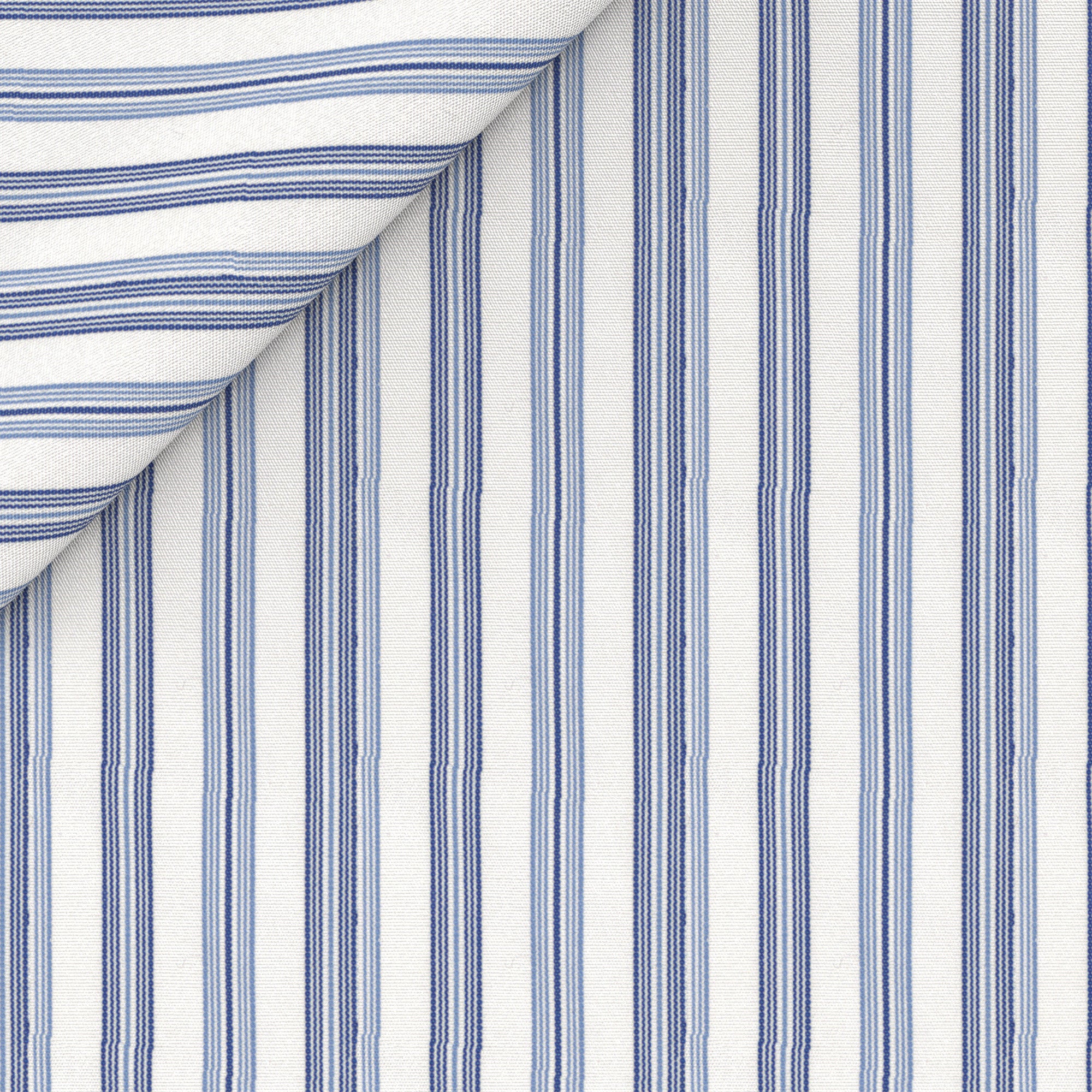 Camisa A Medida confeccionada en algodón de Thomas Mason con una fantasía a rayas azul. Diseñada para looks de negocio, para llevar junto con chaqueta y corbata, como una alternativa a la clásica camisa blanca.