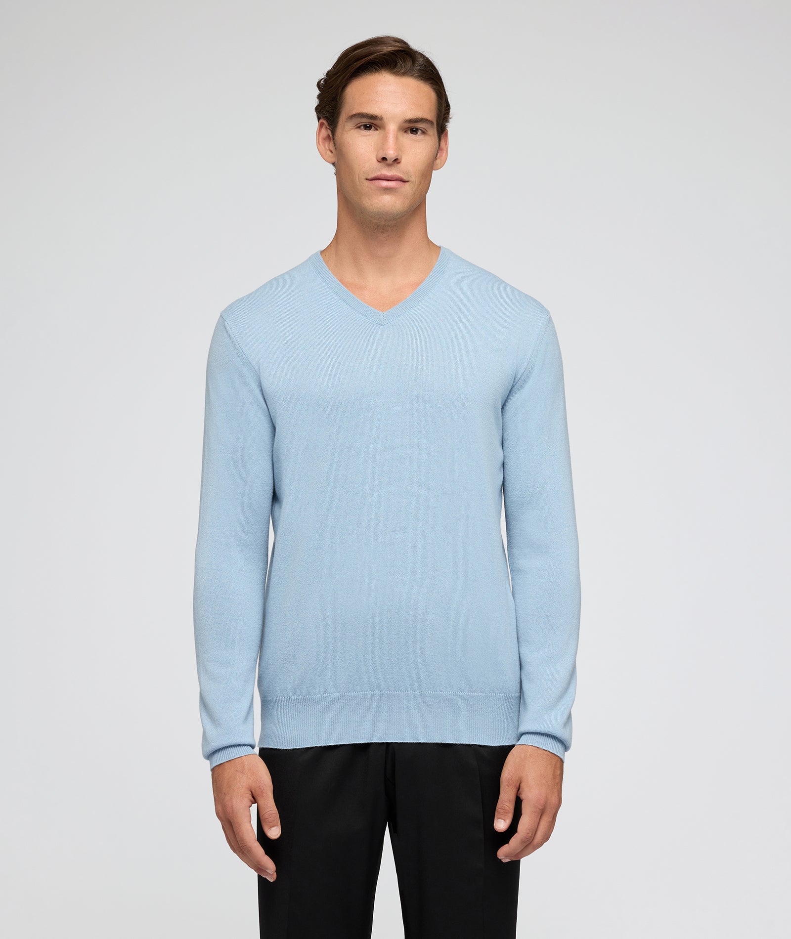 Jersey realizado con un hilo italiano en 100% cachemira. Suave, envolvente, transpirable, se puede personalizar según los propios requisitos de estilo eligiendo entre varios modelos. Una prenda imprescindible del vestuario masculino, en un tono clásico de azul claro.
