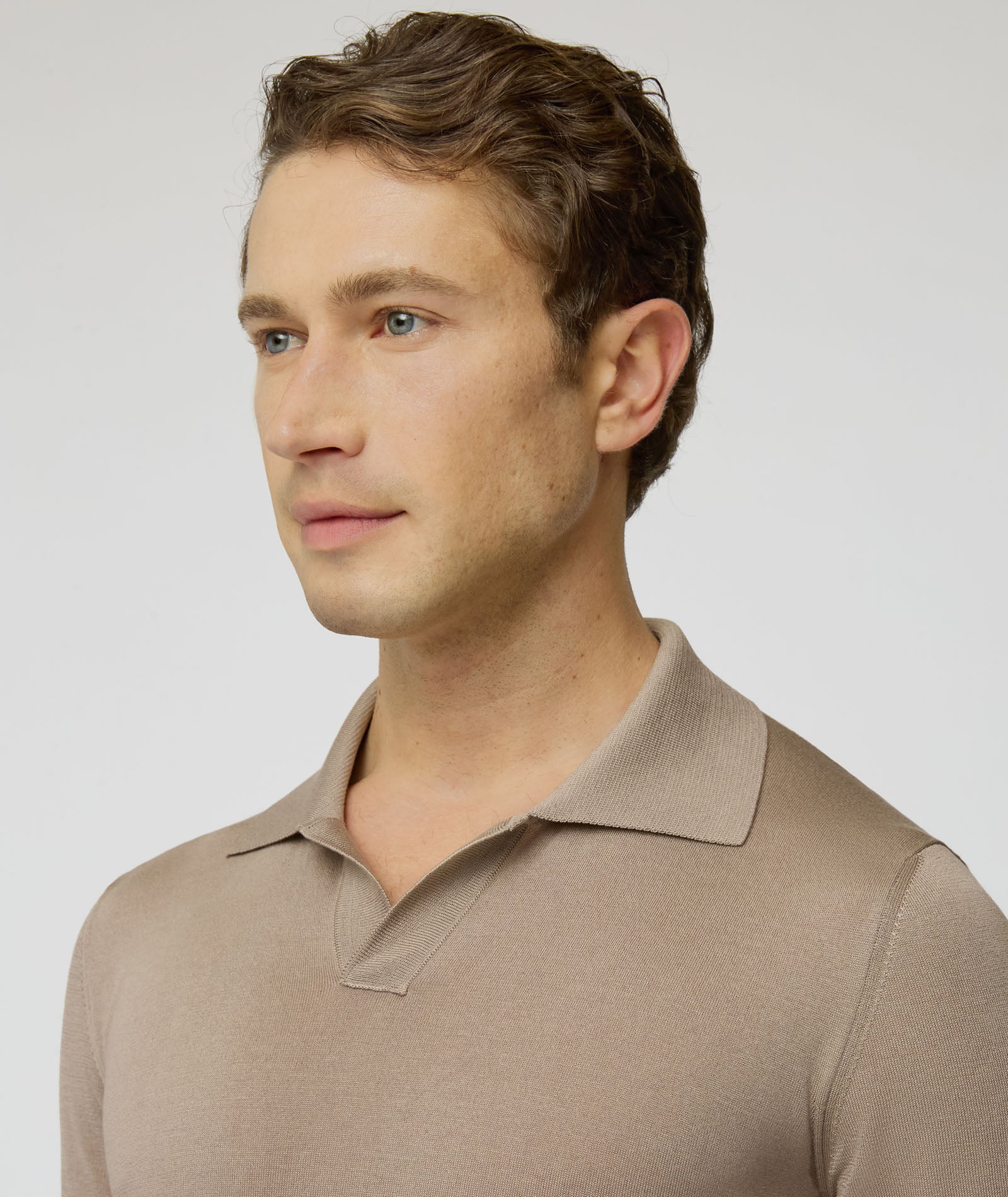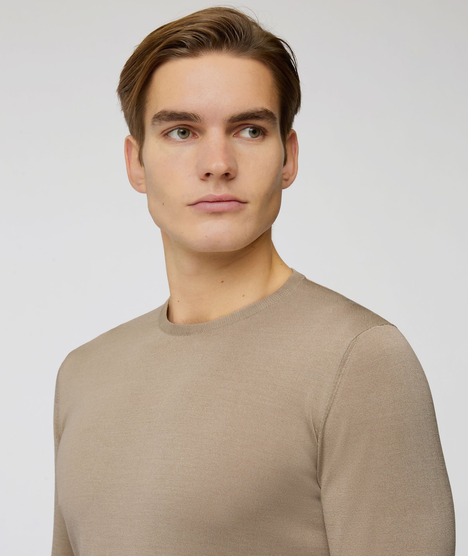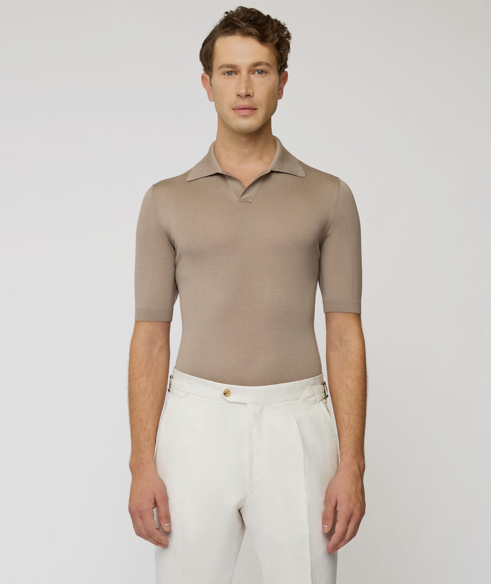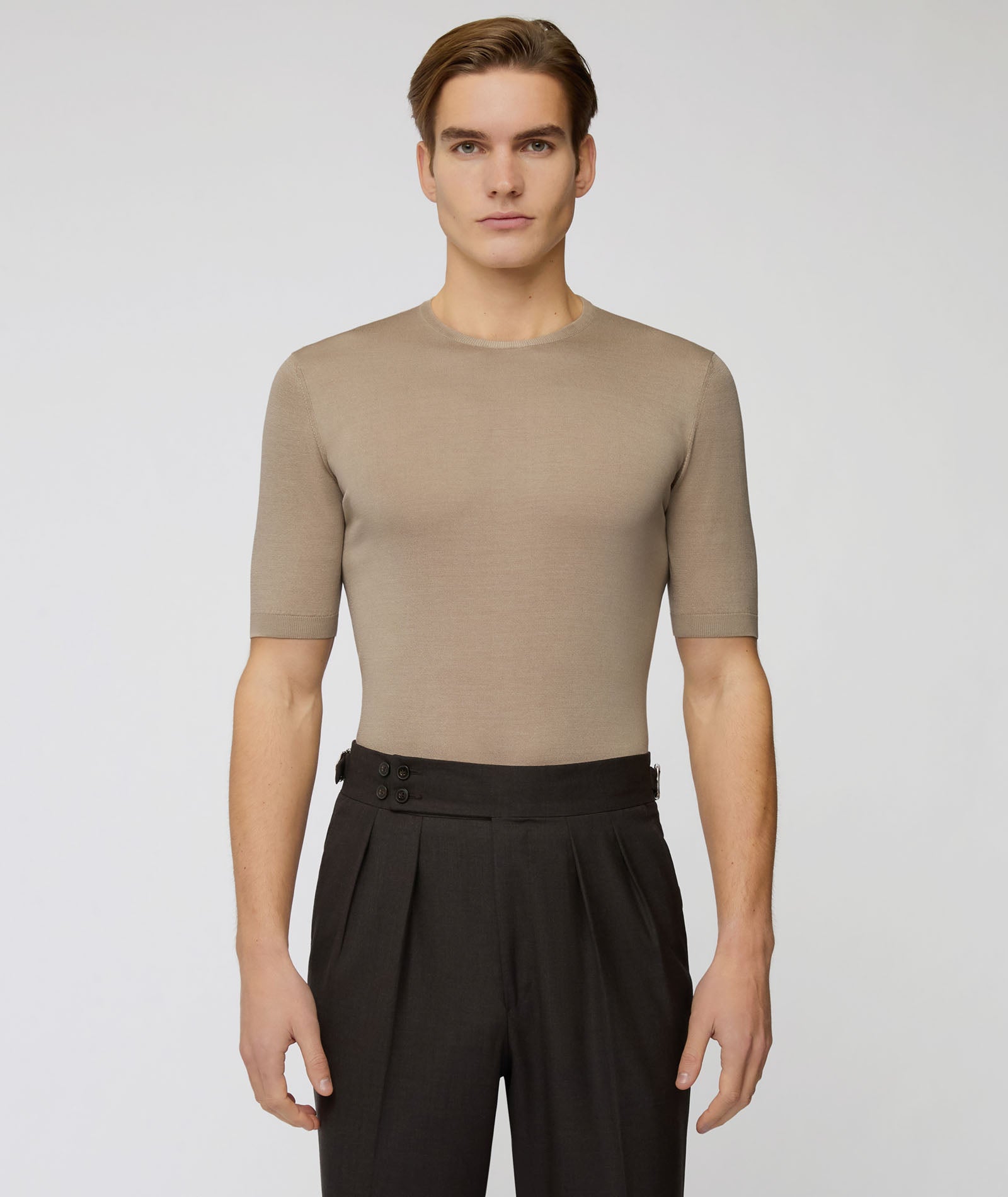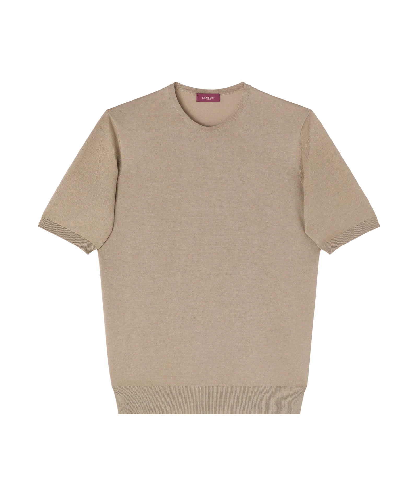 T-shirt in seta e cotone color beige. Una maglia morbida, traspirante e con un finish luminoso dato alla presenza della seta. Da indossare sotto la giacca al posto di una camicia per un look estivo dal tocco casual chic.