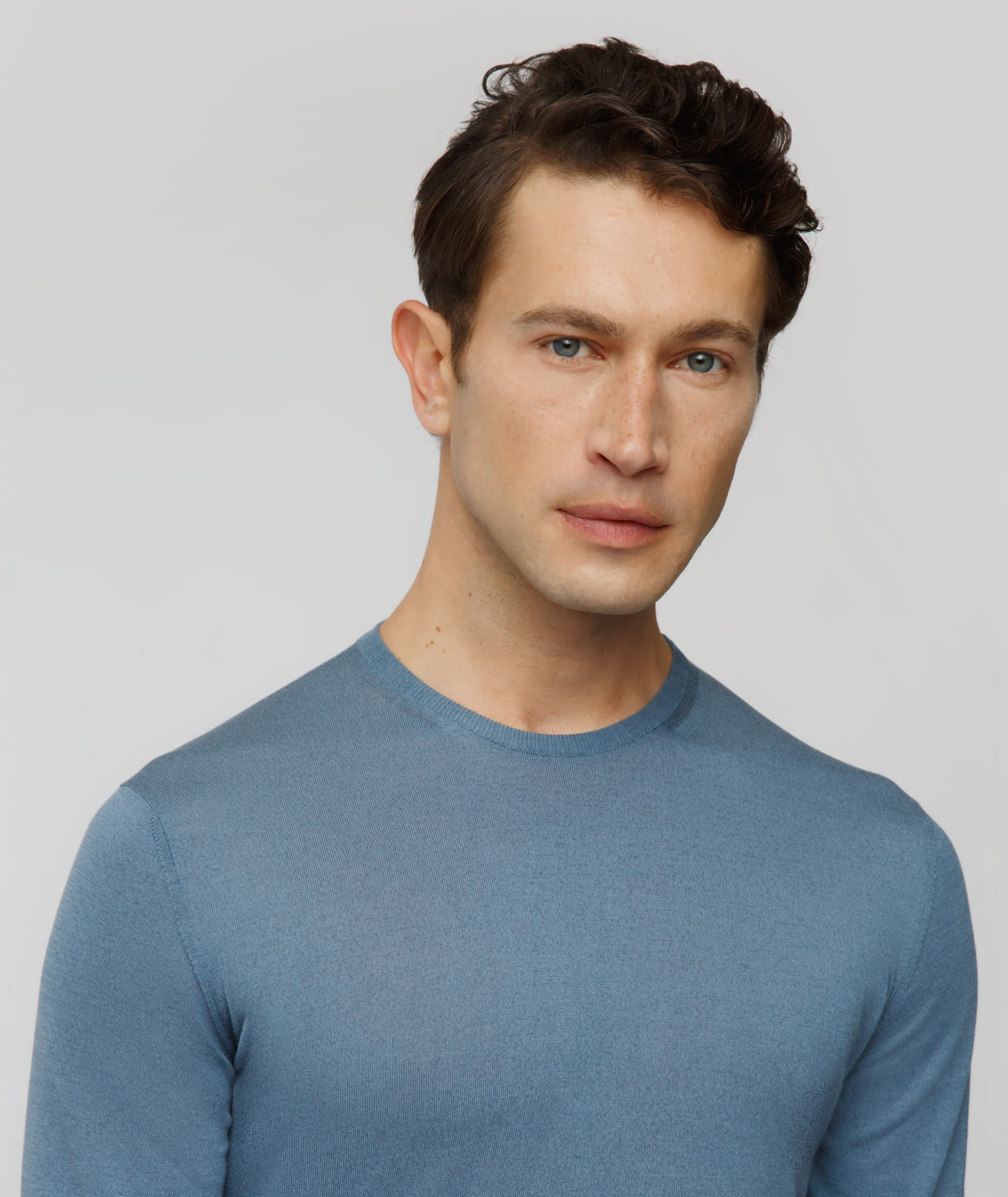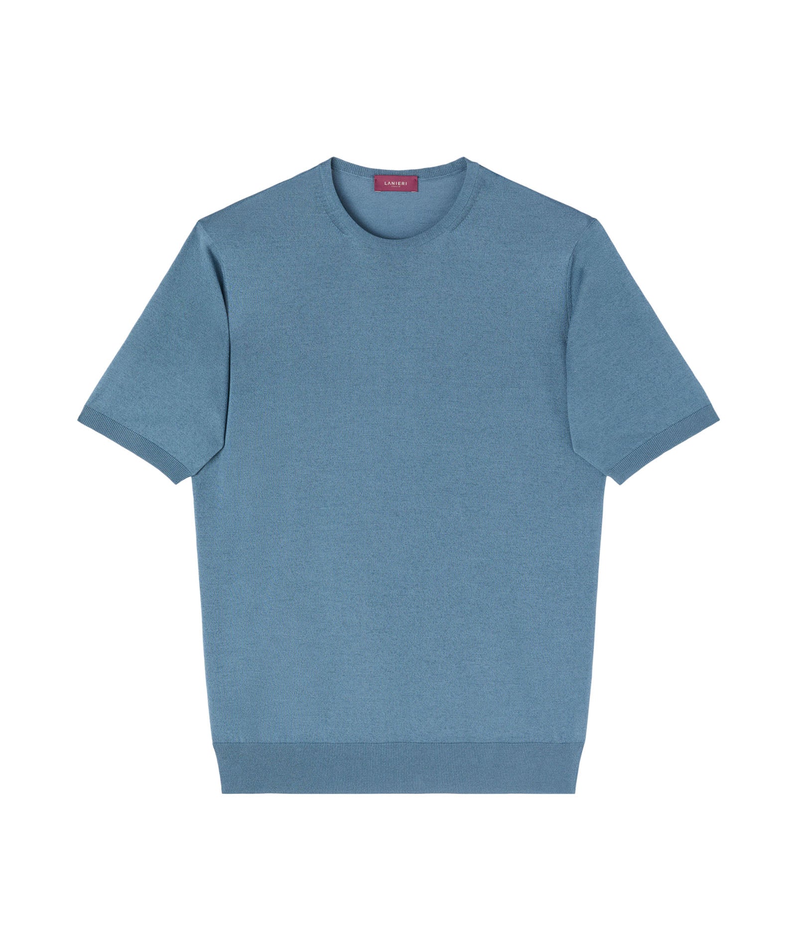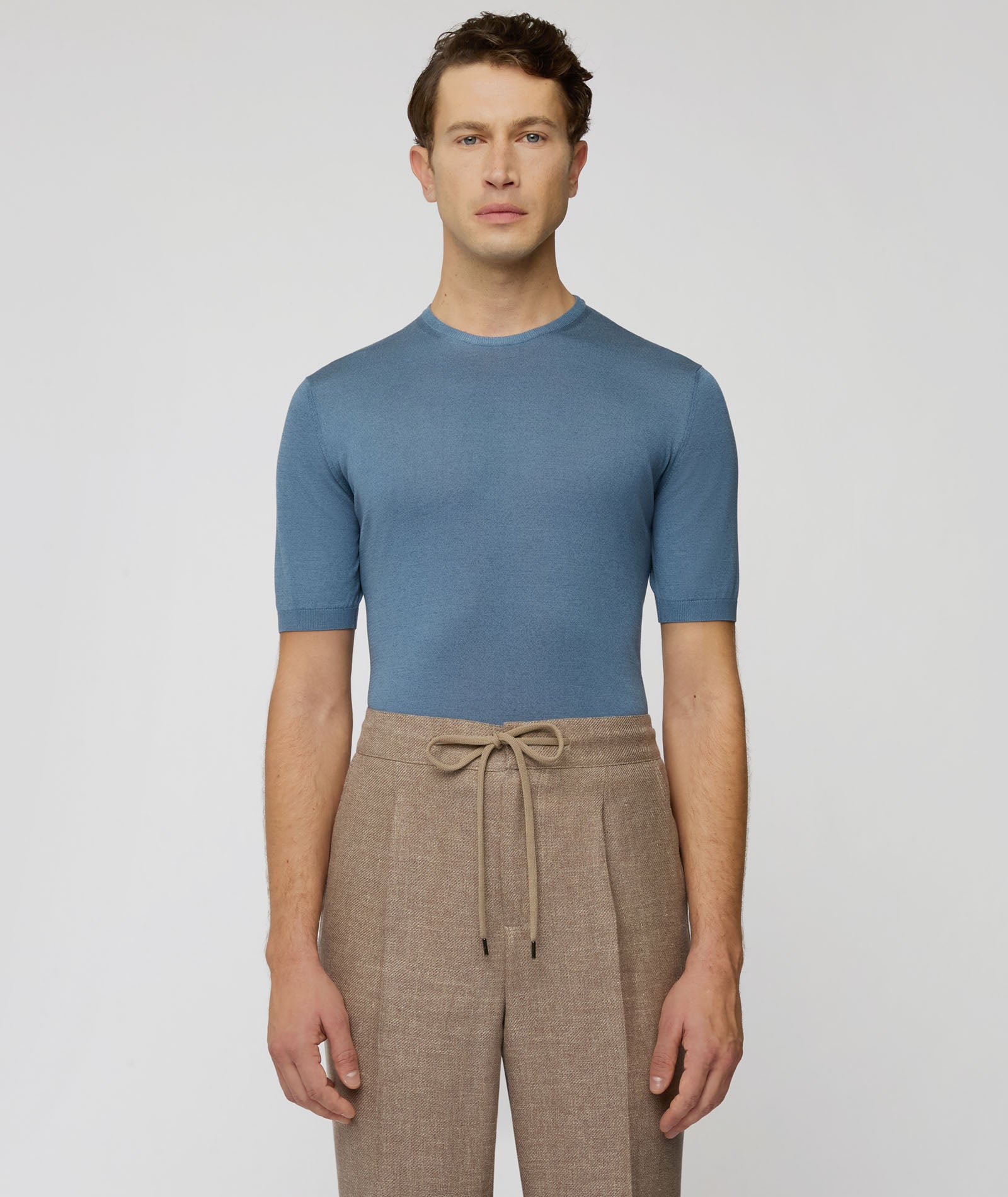 T-shirt in seta e cotone color blu chiaro. Una maglia morbida, traspirante e con un finish luminoso dato alla presenza della seta. Da indossare sotto la giacca al posto di una camicia per un look estivo dal tocco casual chic.