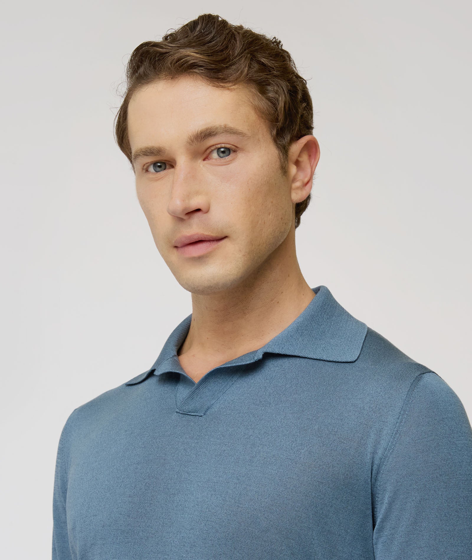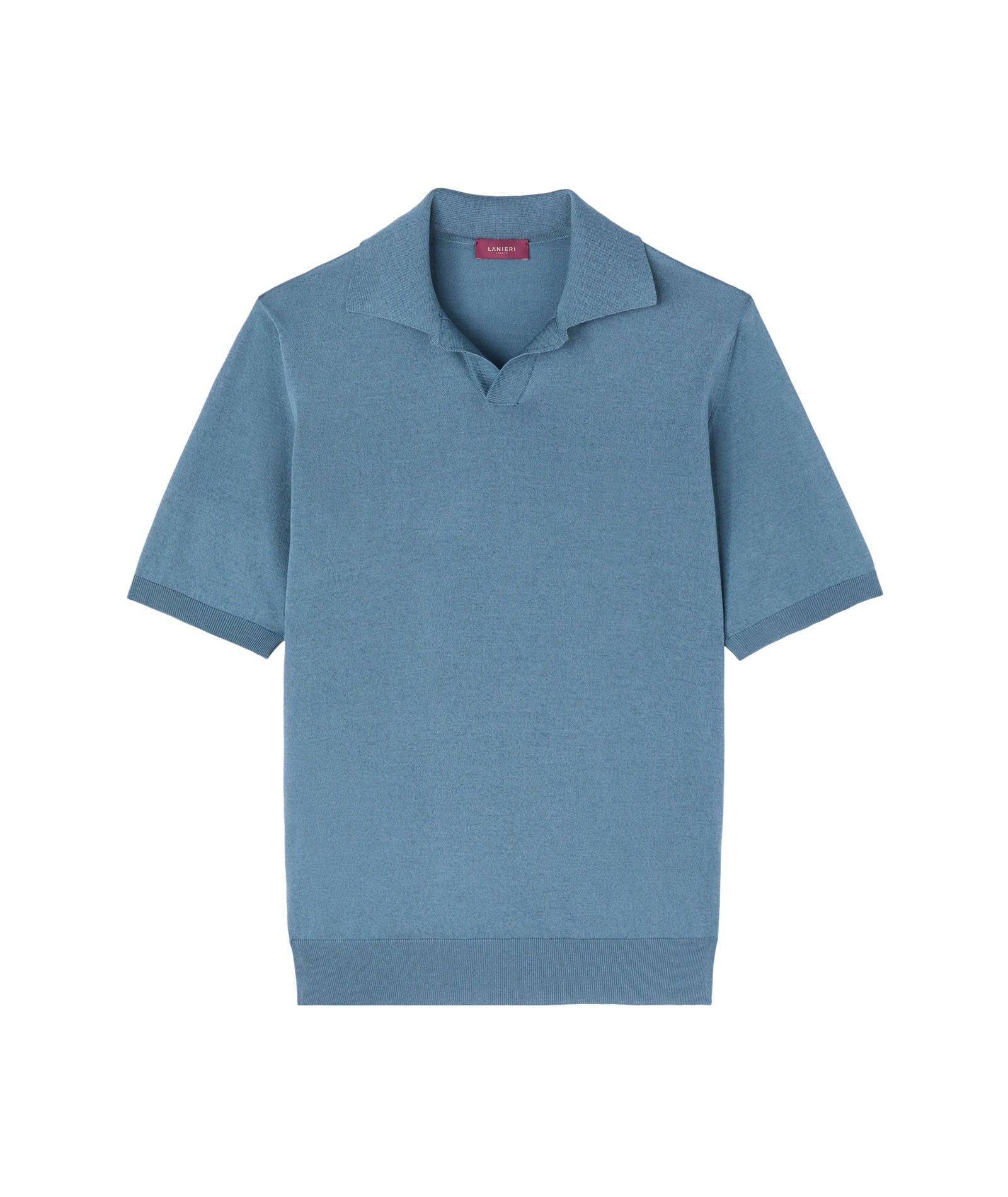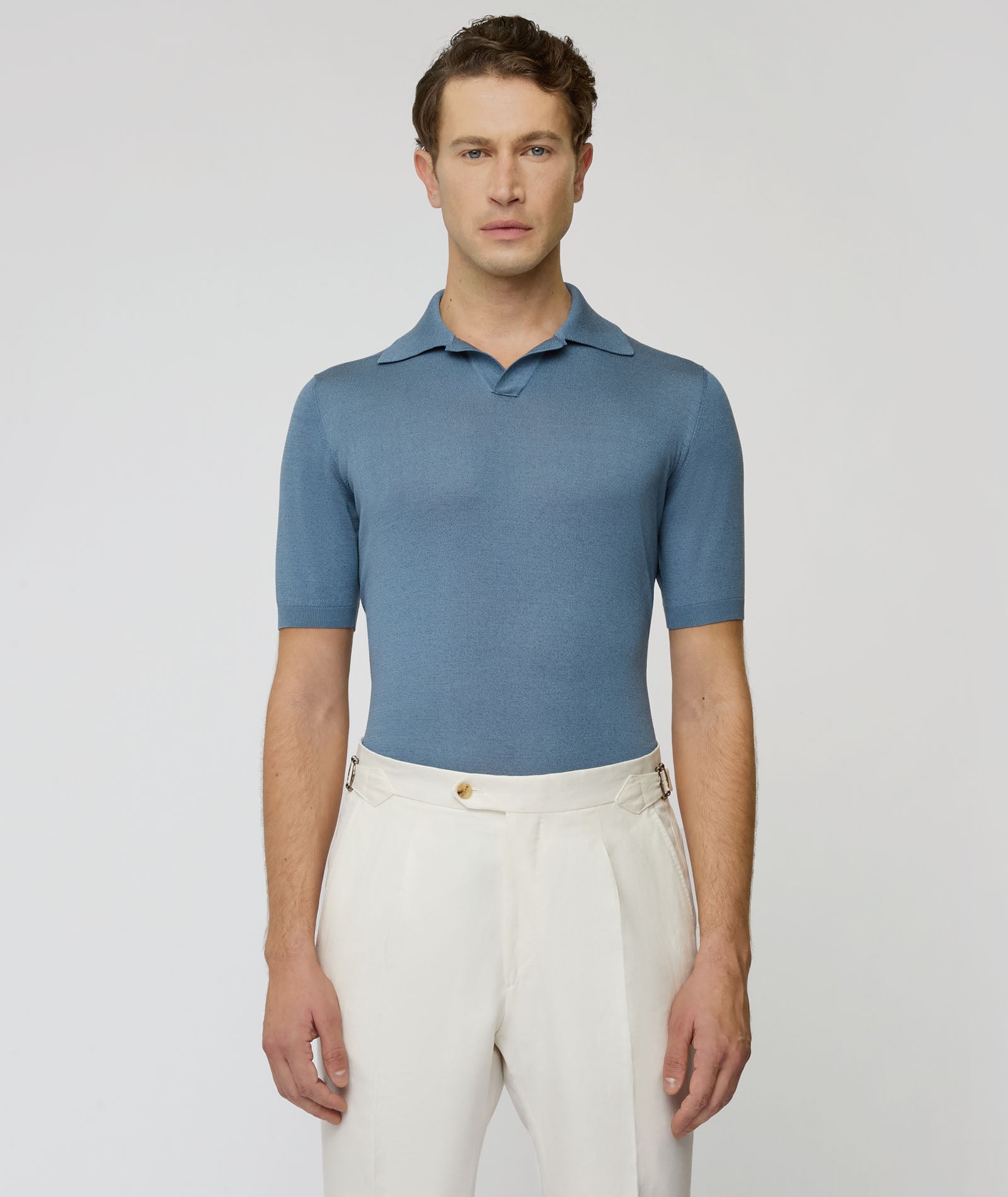 T-shirt in seta e cotone color blu chiaro. Una maglia morbida, traspirante e con un finish luminoso dato alla presenza della seta. Da indossare sotto la giacca al posto di una camicia per un look estivo dal tocco casual chic.