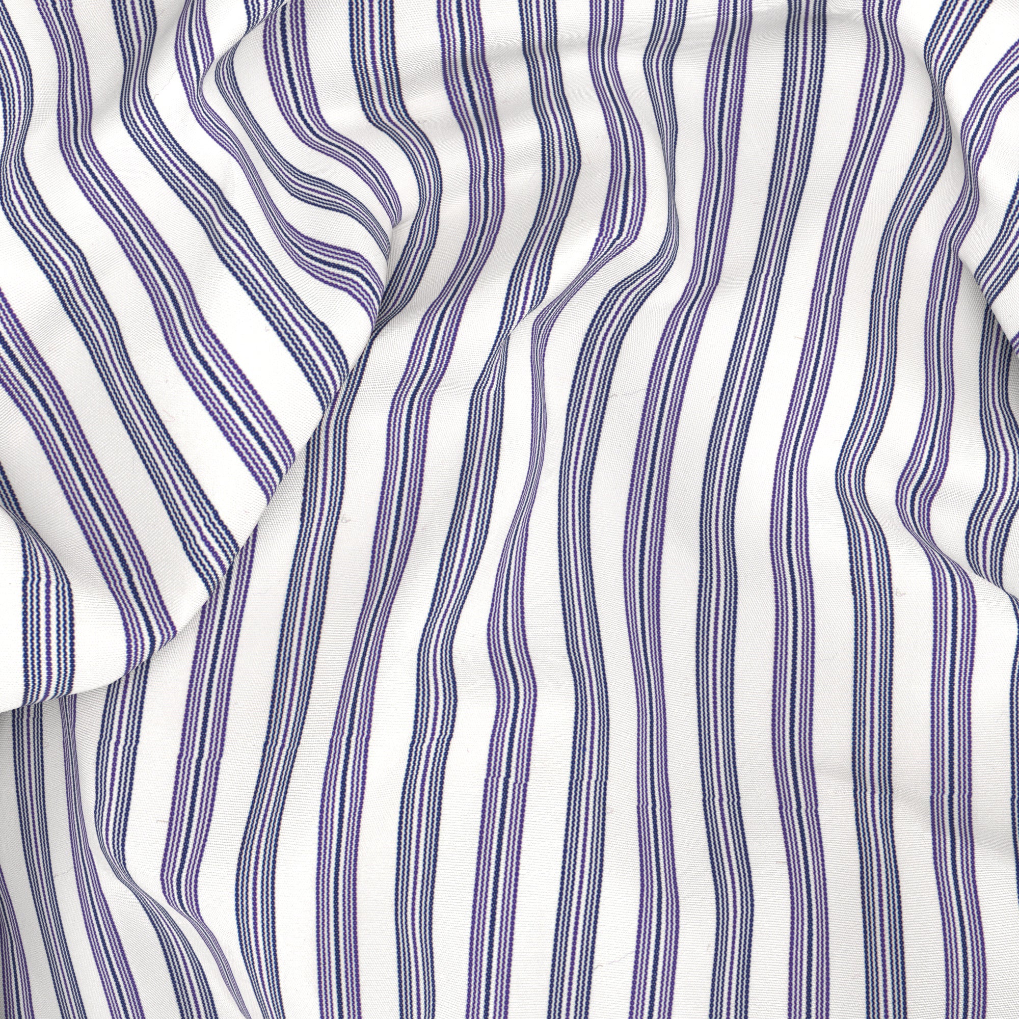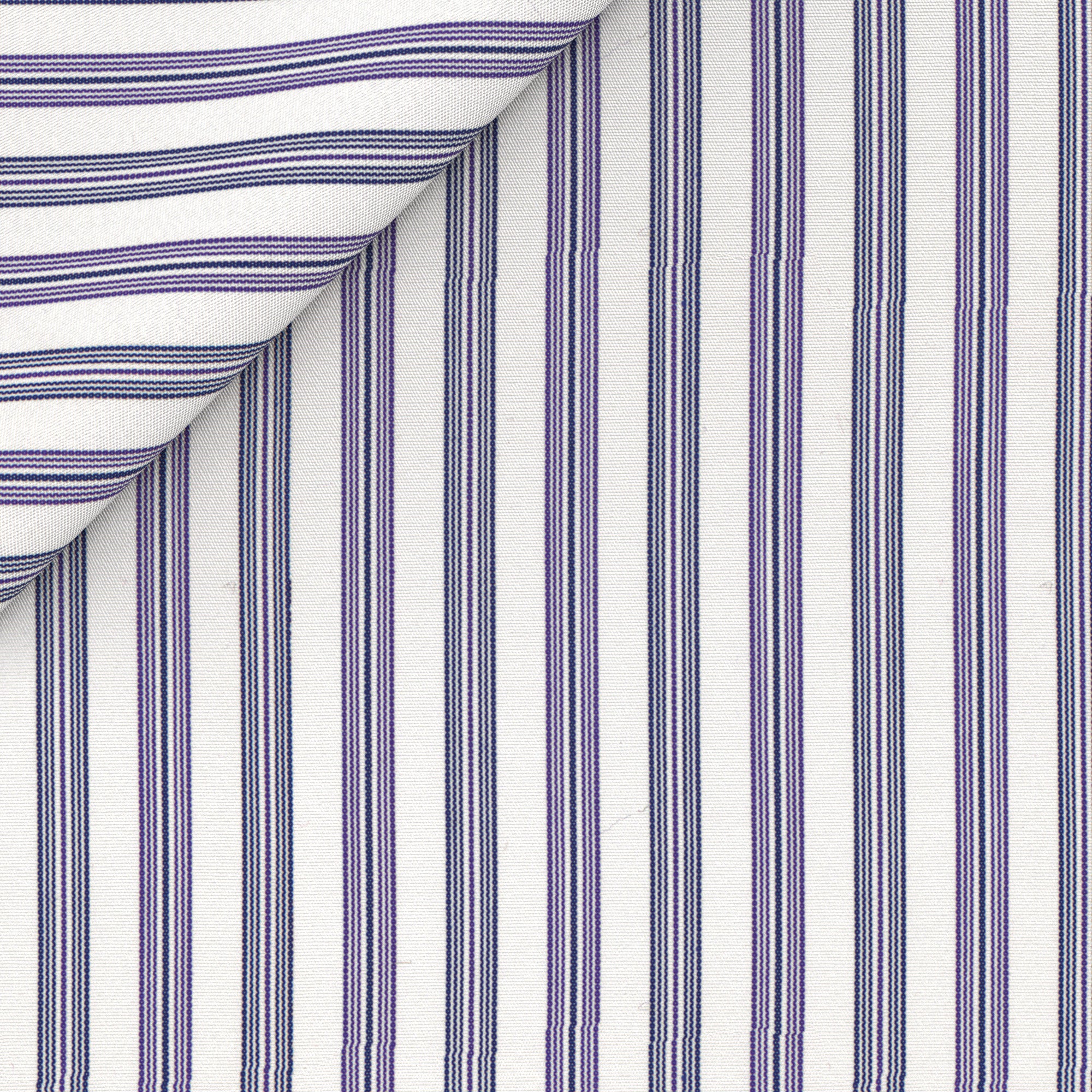 Camicia Su Misura realizzata in cotone di Thomas Mason con una fantasia rigata azzurra e viola. Pensata per i look business, da indossare insieme a giacca e cravatta, come alternativa rispetto alla classica bianca.