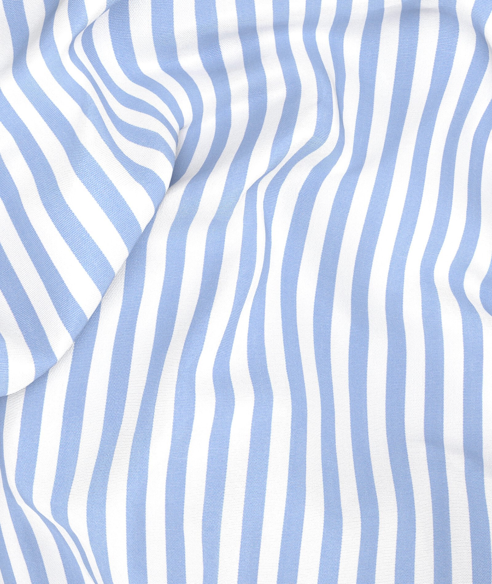 Questa camicia Su Misura è realizzata in Italia con un tessuto in cotone a righe azzurre del cotonificio Alfatex. In 100% popeline di cotone, è una camicia immancabile nel guardaroba di ogni uomo, il complemento perfetto per il classico abito blu da ufficio.