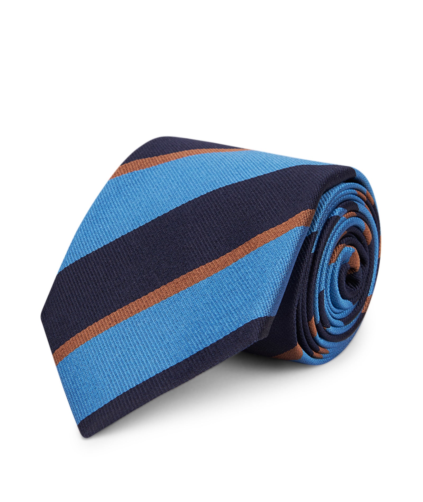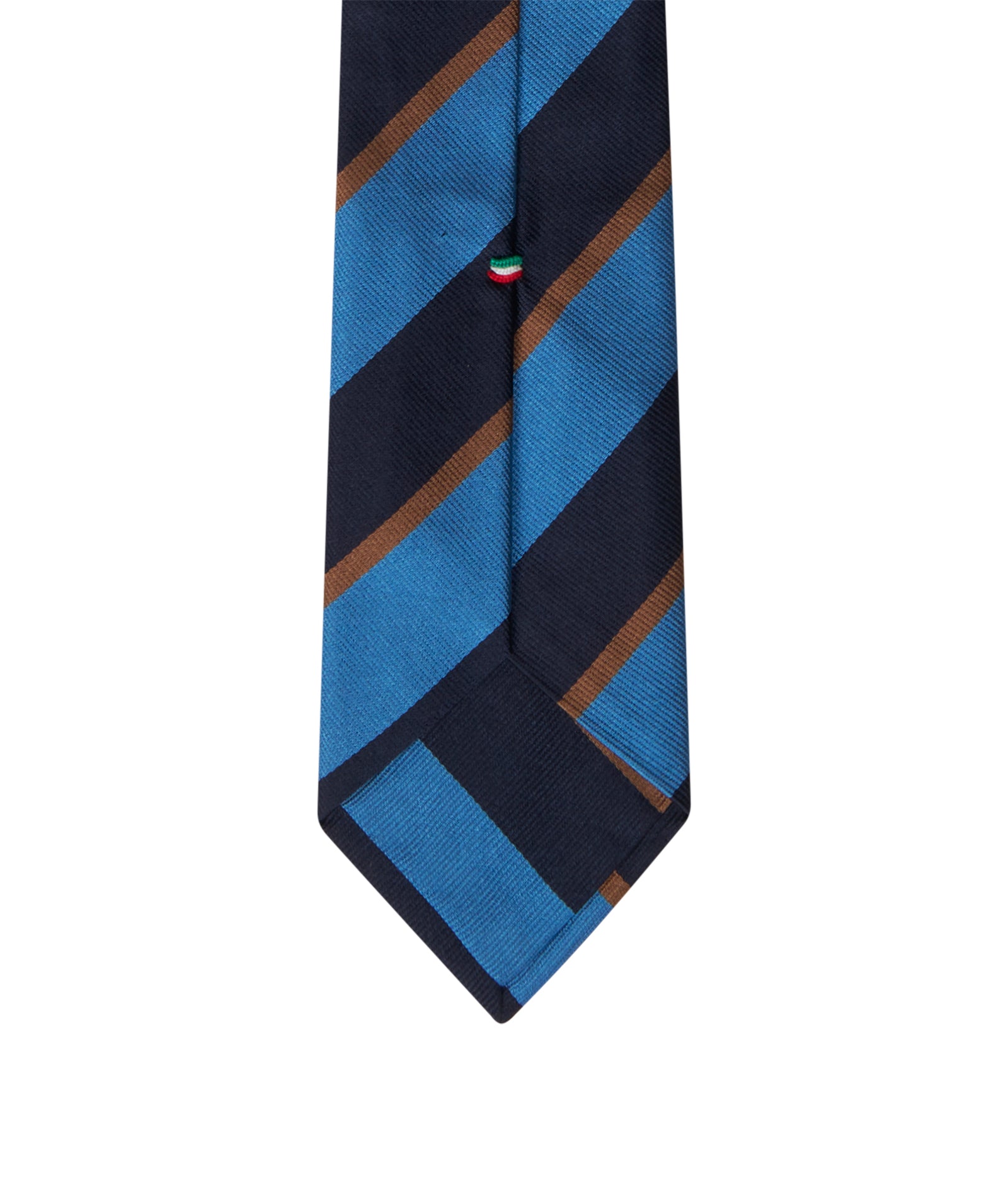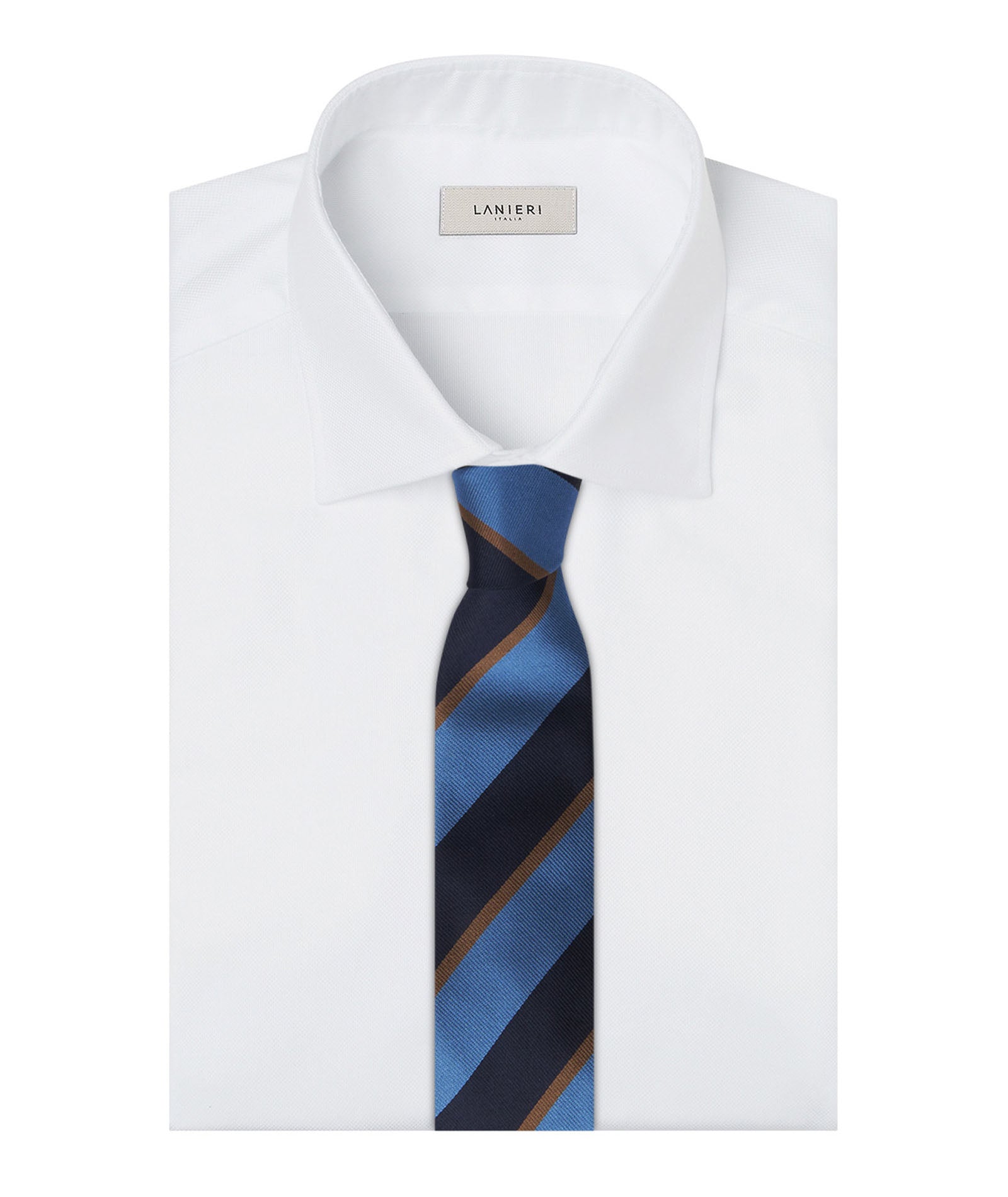 Cravatta realizzata in Italia in raso di seta con la classica fantasia regimental nei toni dell'azzurro, del blu e del marrone. Un accessorio dal fascino tradizionale da indossare nei look formali.