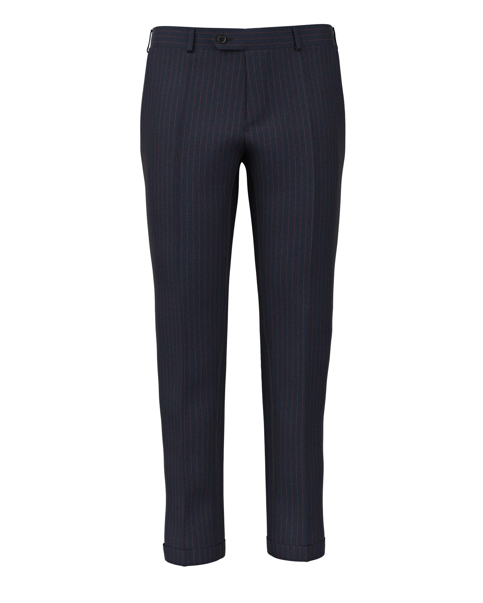 Made-to-Measure trousers crafted in wool flannel from the Reda mill. In classic blue tones, the fabric is enlivened by a red chalkstripe that adds a bright touch to the garment. To wear in winter, on colder days, with a shirt and tie or with a turtleneck for a more informal touch, even at the office.